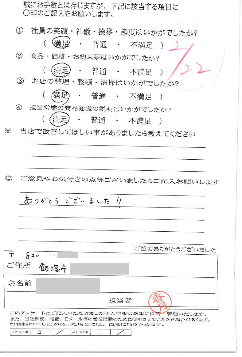 2/22 嘉麻市のお客様 担当者(香月) お客様の声(販売) 2025.02.28社員の笑顔・礼儀・挨拶・態度はいかがでしたか?【満足】商品・価格・お約束事はいかがでしたか?【満足】お店の整理・整頓・清掃はいかがでした?【普通】担当営業の商品知識の説明はいかがでしたか?【満足】※当店で改善してほしい事がありましたら教えてください。◎ご意見お気付きの点など、ございましたらご記入お願いします。ありがとうございました!!