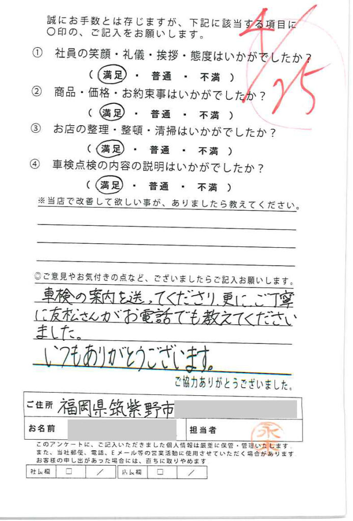 車検の案内を送ってくださり、更に、ご丁寧に友松さんがお電話でも教えてくださいました。