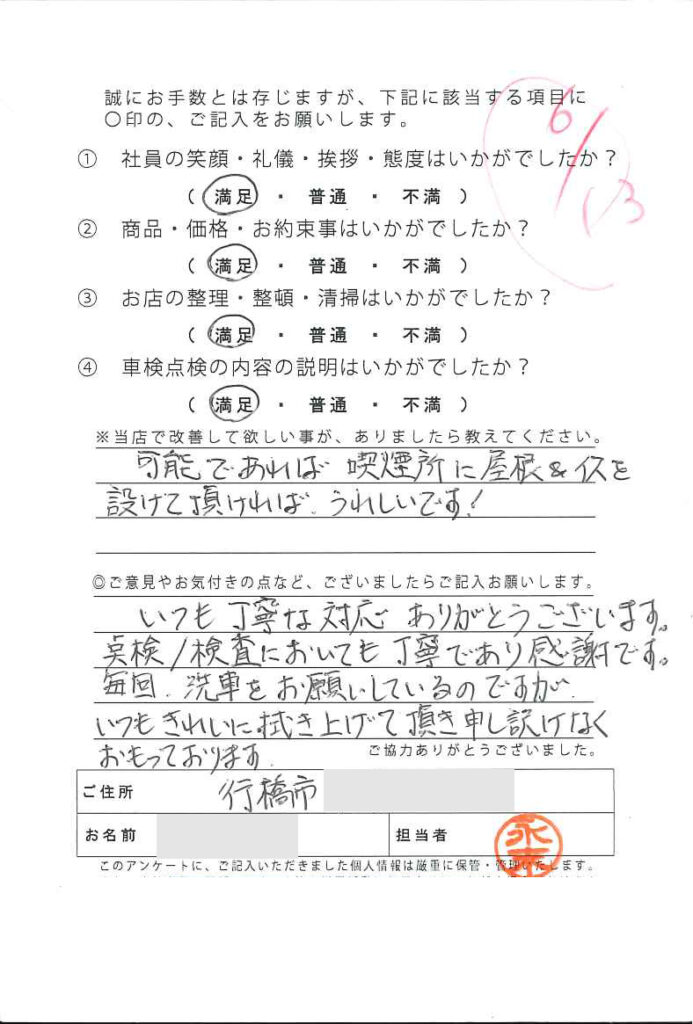 毎回、洗車をお願いしているのですが、いつもきれいに拭き上げて頂き申し訳なくおもっております。