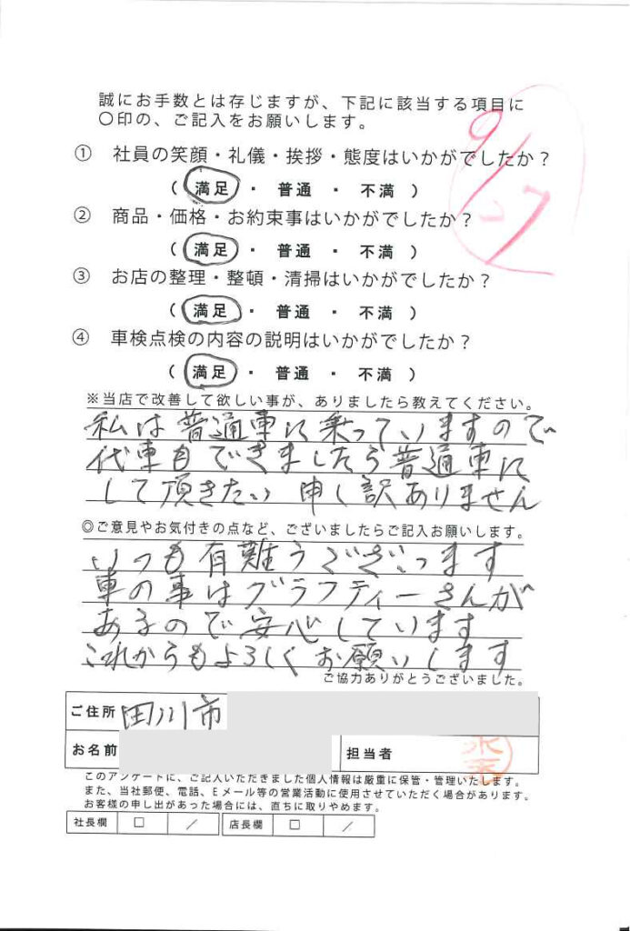 私は普通車に乗っていますので、代車もできましたら普通車にして頂きたい。